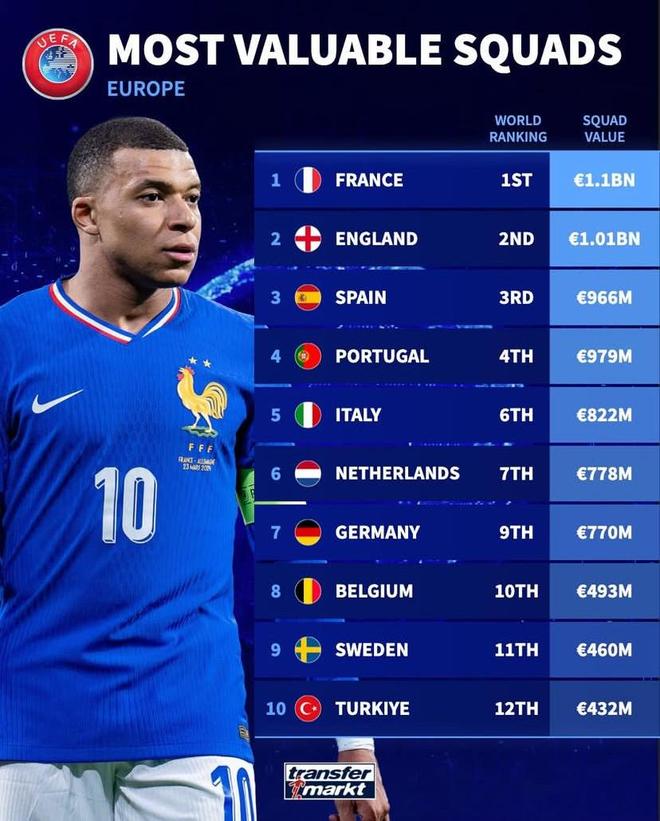 德转列欧洲国家队身价前:法国11亿欧元第1,英格兰超10亿第2