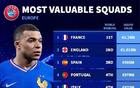 德转列欧洲国家队身价前:法国11亿欧元第1,英格兰超10亿第2